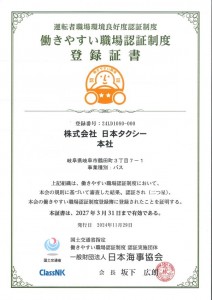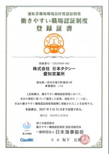 この度、日本タクシーでは2023年6月1日に取得しました運転者職場環境良好度認証制度(働きやすい職場認証制度)二つ星更新しました。