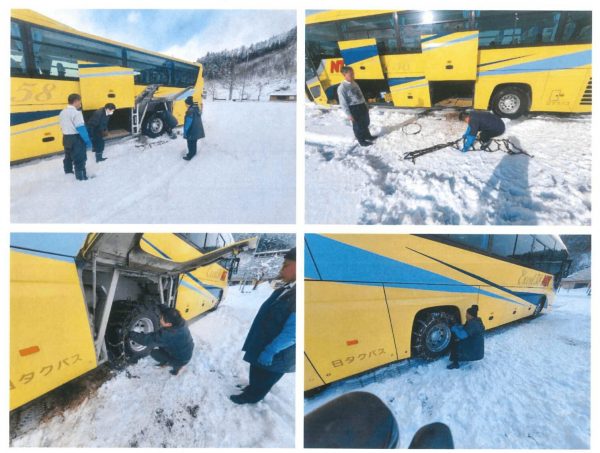 積雪道路における走行方法やチェーンの着脱手順を学び、円滑に作業を行えるよう訓練を実施する。